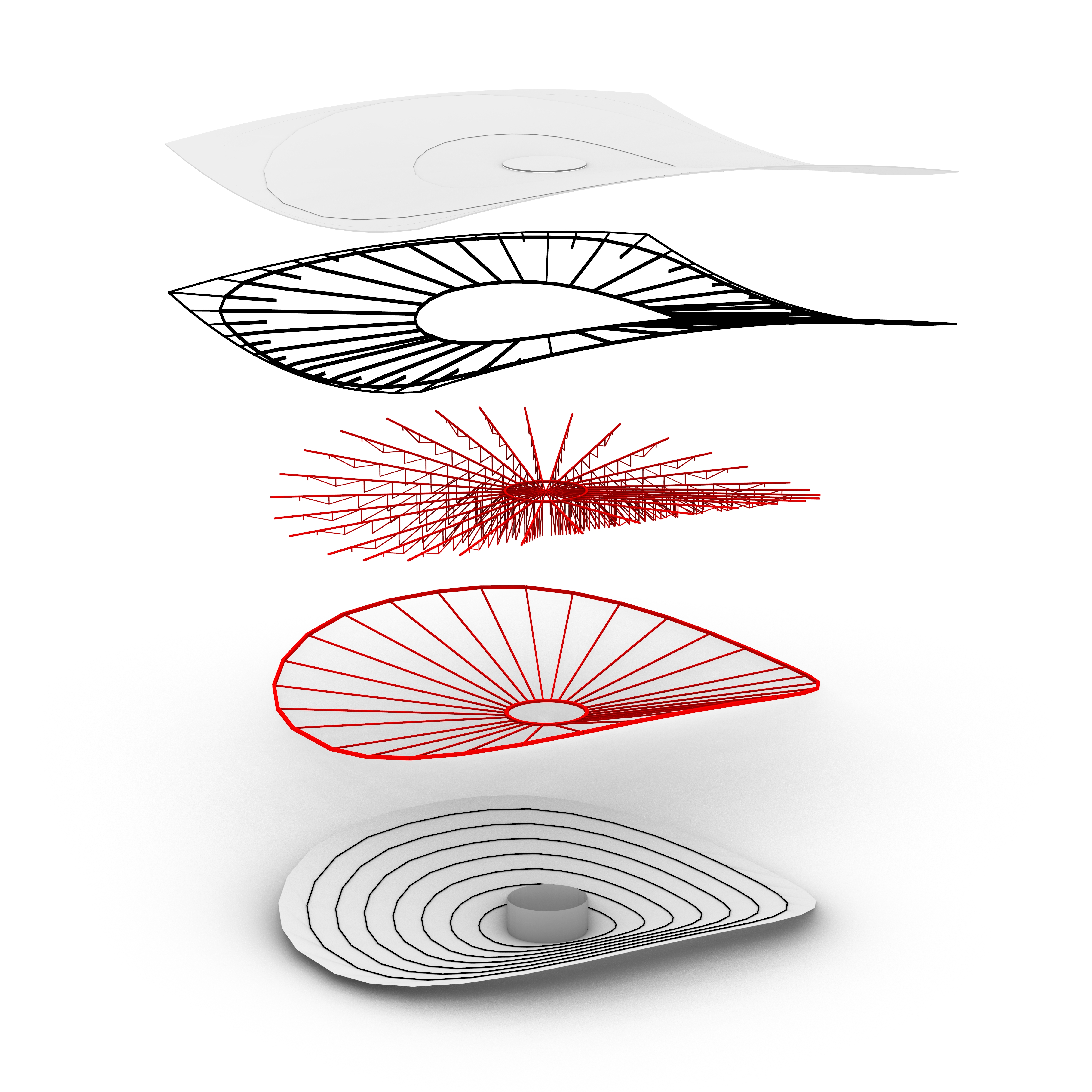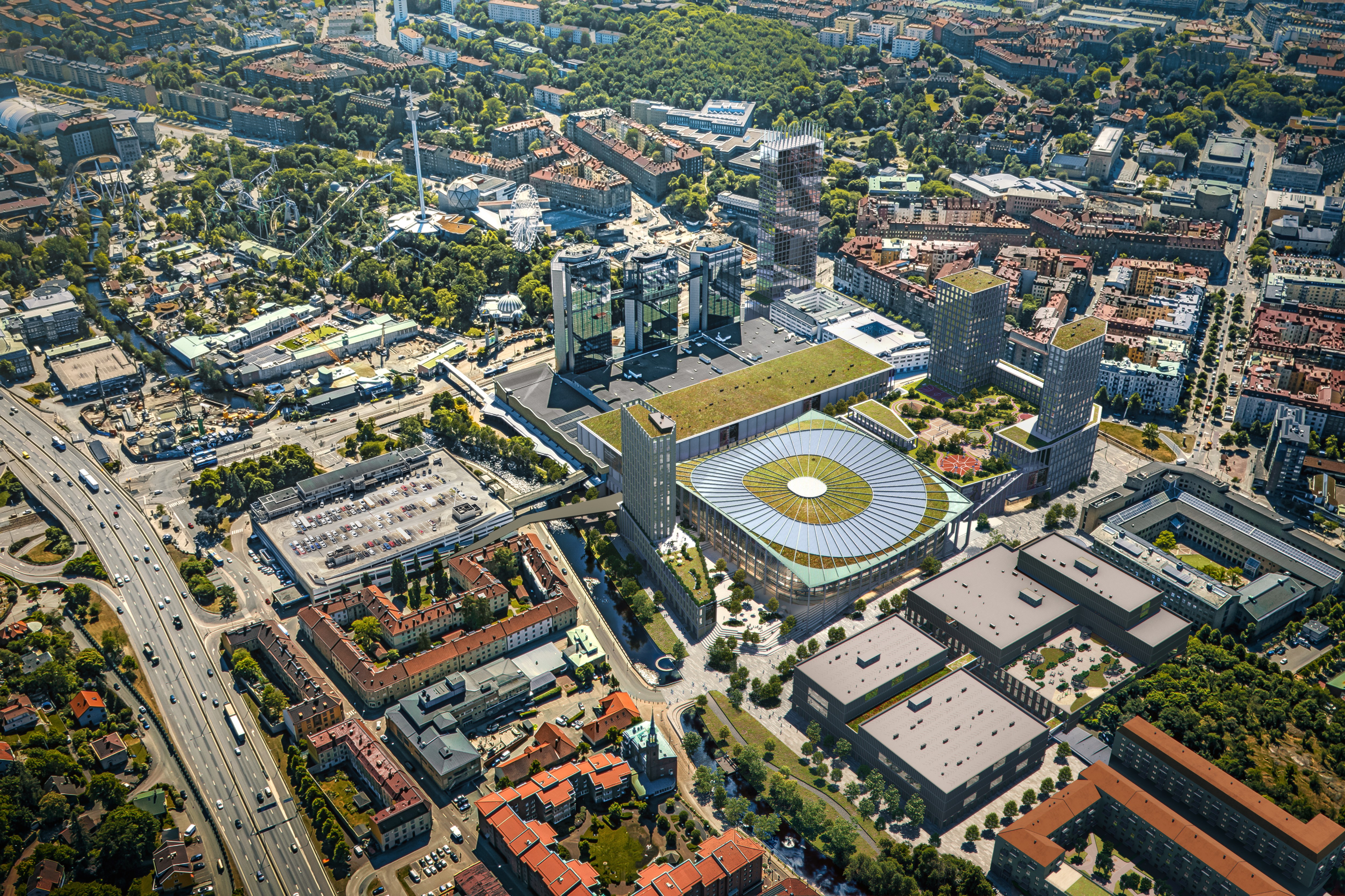 Vårt förslag på takkonstruktion var en robust och materialeffektiv rymdstruktur bestående av ekrar, fackverk och ringbalkar. Detta kan enklast beskrivas som Scandinaviums dubbelkrökta takstruktur, uppdaterad för dagens och morgondagens höga lastkrav. Vår föreslagna takstruktur hade kapacitet att hantera 200 ton evenemangslast med en ytterst begränsad nedböjning. På grund av den materialeffektiva strukturen kunde vi öka bärförmågan i systemet och samtidigt reducera stålmängden i takkonstruktionen med 30% jämfört mot den från den genomförda förstudien. Detta motsvarade en besparing om drygt 1 100 ton stål eller 2 700 ton CO2e.